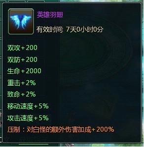 活动内容:开服前3天内,累计充值达到200元,即可免费获取英雄羽翅,英雄羽翅持续7天