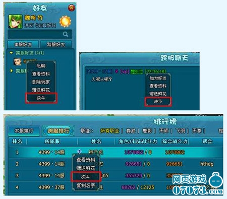 ¡¡¡¡(1)ÔÚ¿ç·þºÃÓÑÁÐ±í¡¢¿ç·þÁÄÌì¿ò¡¢ÅÅÐаñÖÐÑ¡ÔñÄ¿±êÍæ¼Ò£¬ÔÚÏÂÀ²Ëµ¥Öеã»÷“¾ö¶·”ÏòÍæ¼Ò·¢Æð¾ö¶·¡£