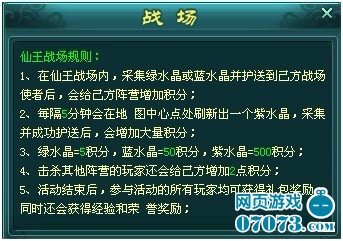 ¡¡¡¡»î¶¯¹æÔò£º¿ªÆô¿ç·þµÄ·þÎñÆ÷Íæ¼Ò½øÈëÕ½³¡ºó£¬»á¸ù¾Ý²»Í¬·þÎñÆ÷±»»®·ÖΪ·ç¡¢Àס¢»ðÈý¸öÕóÓª£¬Í¬Ê±±äÉí³É¶ÔÓ¦µÄÍâÐΡ£Í¨¹ý²É¼¯²¢³É¹¦»¤ËÍË®¾§¡¢»÷ɱÆäËûÕóÓªÍæ¼ÒºÍÊØ»¤ÊÞ½Ô¿ÉΪ±¾ÕóÓªÔö¼Ó»ý·Ö¡£×îºó»ý·Ö×î¸ßµÄÕóÓª»ñʤ£¬²¢Äܵõ½ÏÉÍõÕ½¹Ú¾üÀñ°ü½±Àø£¬µÚ¶þ¡¢ÈýÃûÕóÓªÍæ¼ÒÒ²¿É»ñµÃ²ÎÓëÀñ°ü½±Àø¡£