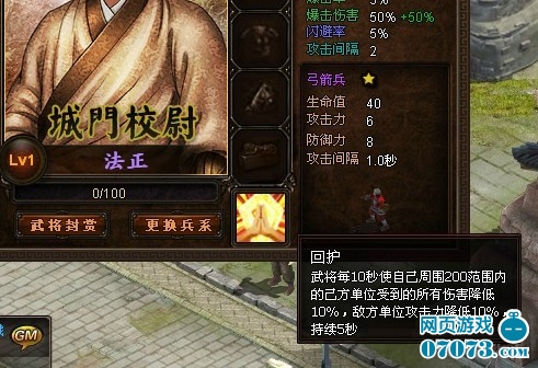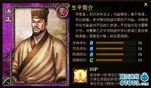 ¡¡¡¡¼¼ÄܽéÉÜ£º·¨Õý¼¼ÄÜÊǻػ¤¡£»Ø»¤£ºÎ佫ÿ10Ãëʹ×Ô¼ºÖÜΧ200·¶Î§Äڵļº·½µ¥Î»Êܵ½µÄËùÓÐÉ˺¦½µµÍ10%£¬µÐ·½µ¥Î»¹¥»÷¾Í½µµÍ10%¡£Õâ¼¼ÄܵÄÌØµã¾ÍÊDz»ÓõȰٷֱȷ¢¶¯£¬°Ù·ÖÖ®°Ù·¢¶¯¡£ÔÚËû¸½½üµÄÎÒ·½ÈºÖÚ¶¼¿ÉÒÔÏíÓÃËûµÄ·ÀÓù£¬¶øÇҵз½¹¥»÷½µµÍ¡£
