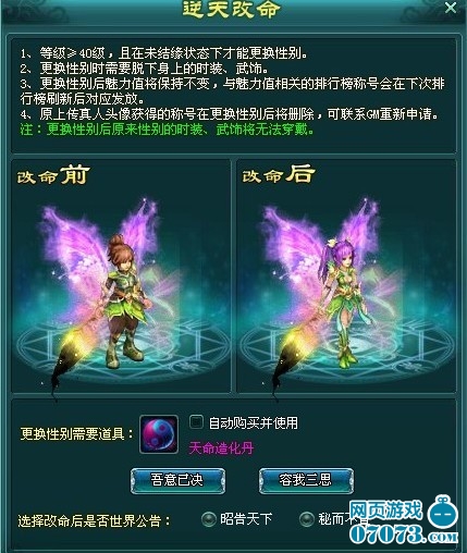 ¡¡¡¡“ÍæÓÎÏ·£¬°ø´ó¿î”!ÔÚ56uu¡¶ÉñħÏɽ硷ÀֻҪµÈ¼¶´ïµ½40¼¶¾Í¿ÉÒÔ¸ü»»×Ô¼ºµÄÐÔ±ð¡£Íæ¼ÒÃÇÔÚת»»ÐÔ±ðʱÐèÍÑÏÂÉíÉÏʱװ£¬×ª»»ÐÔ±ðºó£¬ÔÐÔ±ðµÄʱװ½«ÎÞ·¨´©´÷£¬Íæ¼ÒÃÇÒ²¿ÉÑ¡Ôñת»»ÐԱ𹫸æÌìÏ»òÃØ¶ø²»Ðû;ת»»ÐÔ±ðºó£¬ÅÅÐаñÉϵÄÐÔ±ðÐÅÏ¢½«ÔÚÏÂÒ»´ÎË¢ÐÂʱ¸üС£¸ü»»Ö®ºóÏëÔٴθü»»¾ÍÐèÒªÒ»¸öÔÂÖ®ºóÁË¡£
