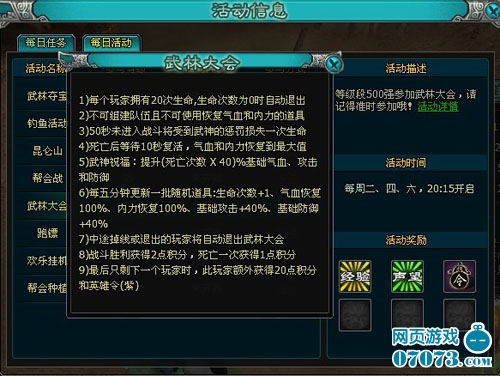 ¡¡¡¡ÎäÁÖ´ó»áÿÖܶþ¡¢ËÄ¡¢Áù20£º10-21£º00׼ʱ¿ªÆô£¬Íæ¼ÒÐèÒªÌáǰ5·ÖÖÓ½ø³¡×¼±¸¡£´ó»á°´Íæ¼ÒµÈ¼¶·ÖÈü³¡£ºÎäÁÖ´ó»á-³õ¼¶£º30-49¼¶µÈ¼¶ÅÅÃûǰ500ÃûµÄÍæ¼Ò£¬ÎäÁÖ´ó»á-Öм¶£º50-69¼¶µÈ¼¶ÅÅÃûǰ500ÃûµÄÍæ¼Ò £¬ÎäÁÖ´ó»á-¸ß¼¶£º70¼¶ÒÔÉϵȼ¶ÅÅÃûǰ500ÃûµÄÍæ¼Ò¡£Ã¿ÈËÓÐ20´ÎÉúÃü£¬ÉúÃü´ÎÊýΪ0ʱ£¬¾Í»á±»´«³ö³¡Íâ £¬ÖÐ;Í˳ö»òµôÏßµÄÍæ¼ÒÊÓΪ·ÅÆú²ÎÈü¡£