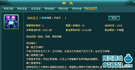¡¡¡¡°ïÅɻ֮ʥÍõµÄÌôÕ½£¬×ܹ²ÓÐ3²ã£¬·Ö±ðÓУºÎåÐÐÉñÕó¡¢Ú¤ÏëÖ®Ô¨¡¢ÐéÉñ¹¬¡£°ïÅɵȼ¶≥2¼¶£¬µÈ¼¶≥30¼¶µÄ°ïÅɳÉÔ±½Ô¿É²ÎÓ룬ÓɰïÖ÷ºÍ¸±°ïÖ÷ÔÚ°ïÅÉÒ³Ãæ°ïÅÉ»î¶¯Ò³Ãæ½øÐпªÆô£¬Í¬Ê±Óмòµ¥¡¢À§ÄÑ¡¢µØÓüÄѶÈÑ¡Ôñ£¬Ã¿Ìì½öÄÜ¿ªÆô1´Î¡£