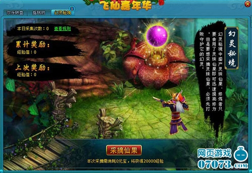 ¡¡¡¡»ÃÁéÃØ¾³Îª¼ÎÄ껪½çÃæÏµÄÒ»¸öй¦ÄÜ£¬Íæ¼ÒÿÌì¿ÉÃâ·Ñ½øÈëÃØ¾³²ÉÕªÏɹûÒ»´Î£¬¶îÍ⻨·ÑÔª±¦»¹¿ÉÖØ¸´½øÈë²ÉÕª£¬²»ÏÞ²ÉÕª´ÎÊý¡£²ÉÕªÏɹû±ØÐëÏÈ»÷°ÜÊØ»¤ÏɹûµÄ»ÃÁ飬²ÉÕªÏɹû³É¹¦¿ÉÒÔ»ñµÃ´óÁ¿¾Ñé½±Àø£¬¿ÉÒÔ¼«´óµÄ¼Ó¿ìÉý¼¶ËÙ¶È¡£