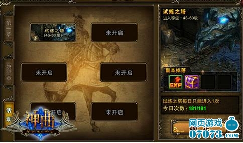 ¡¡¡¡¡¶ÉñÇú¡·µÄÊÔÁ¶Ö®Ëþ£¬´ÓÓë¸÷·ӢÐ۵ijõ´Î¼ûÃæ¿ªÊ¼£¬¾ÍÅû×ÅÉñÃØµÄÃæÉ´£¬ÈÃÈËÈ̲»×¡ÏëҪһ̽¾¿¾¹¡£Ç×ÃÇÏëÒª½øÈë´ËµØ£¬½Ò¿ªÉñÃØÃæÉ´Âð?¸Ï½ô´øÉÏÄãµÄÇ×ÓÑÍÅ£¬¿ªÊ¼Ðж¯°É¡£ÊÔÁ¶Ö®ËþµÄÌôÕ½µÈ¼¶Îª46-80¼¶¡£·²½øÈëÊÔÁ¶Ö®ËþµÄÓÂÊ¿ÃÇ£¬Î´ÖªµÄÌôÕ½¼´½«À´ÁÙ£¬¸÷ÖÖÒ©Ë®·ûÎÄÌáǰ±¸ºÃŶ¡£