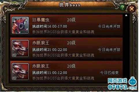 ¡¡¡¡ÊÀ½çBoss——ÊÀ½çBoss»î¶¯Ã¿Ìì11µã£¬16µã£¬22µã¸÷Ò»´Î¡£¶ÔBossÉ˺¦Ô½¸ß»ñÈ¡µÄ»Æ½ðÕ½»êÔ½¶à£¬»ñÈ¡µÄÁ¿ÎªÉ˺¦µÄ10%¡£Óë´Ëͬʱ£¬ÅÅÃûµÚÒ»£¬µÚ¶þ£¬µÚÈýµÄÓÐÅÅÃû½±Àø¡£¶ÔBossÉ˺¦×ÜÁ¿´ïµ½1%£¬¿ÉÒÔ»ñµÃÓÂÊ¿½±ÓÐ50000»Æ½ð£¬50000Õ½»ê¡£