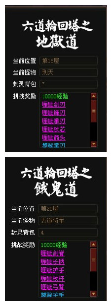 ¡¡¡¡ÁùµÀÂÖ»ØËþÊÇÊ®ÔÂаæµÄºËÐÄϵͳ£¬¹²ÓÐÁù´óËþ²ã£ºµØÓüµÀ£¬¶ö¹íµÀ£¬ÐóÉúµÀ£¬ÐÞÂÞµÀ£¬È˵ÀºÍÌìµÀ¡£Ã¿Ò»¸öÖ÷ÒªËþ²ãÀï¶¼ÓÐ25¸ö½×ÌÝ£¬Ã¿¸ô5¸ö½×ÌݾͻáÓöµ½²»Í¬µÄBOSS£¬ÌôÕ½³É¹¦ºó»áÓм¸ÂÊ»ñµÃ×ÏÉ«·âÁéÆ÷¼þ¡£
