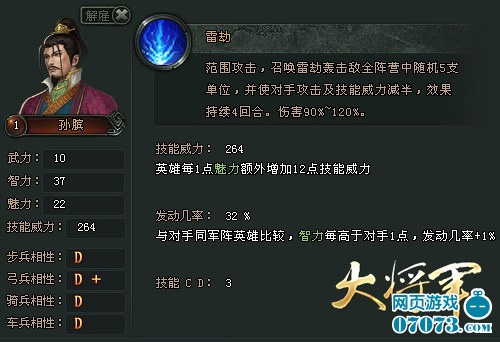 ¡¡¡¡¼¼ÄܽéÉÜ£ºÀ×½Ù£¬·¶Î§¹¥»÷£¬ÕÙ»½À×½Ùºä»÷µÐÈ«ÕóÓªÖÐËæ»ú5Ö§µ¥Î»£¬²¢Ê¹¶ÔÊÖ¹¥»÷¼°¼¼ÄÜÍþÁ¦¼õ°ë£¬Ð§¹û³ÖÐø4»ØºÏ¡£É˺¦90%~120%¡£