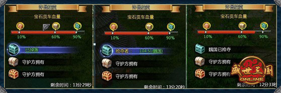 ¡¡¡¡»ñµÃÐí²ýÕ¼ÁìȨµÄ¼Ò×åÐèÔڻʱ¼äÄÚ£¬»¤ËÍÄɹ±Âí³µ°²È«µÖ´ï¡£½ø¹¥·½¿É¹¥»÷Âí³µ£¬µ±Âí³µÑªÁ¿µ½´ï90%£¬60%£¬10%ʱ»áµôÂ䱦ʯÏ䣬µã»÷±¦Ê¯Ïä¶Á½ø¶ÈÌõ½øÐÐÇÀ¶á£¬Õ½¶·Öиùú²ÎÈü¼Ò×åµÄËùÓÐ×åÔ±¶¼ÄÜÊÕµ½Ò»·Ý½±Àø¡£·ÀÊØ·½ÐèÒª±£»¤Âí³µ£¬Èç¹û±¦Ê¯ÏäµôÂ䣬·ÀÊØ·½Í¬ÑùÄܹ»µã»÷±¦Ê¯Ïä½øÐÐÇÀ»Ø¡£ÇÀ»Øºó£¬·ÀÊØ·½²ÎÈü¼Ò×åµÄËùÓÐ×åÔ±¶¼ÄÜÊÕµ½Ò»·Ý¶ÔÓ¦½±Àø¡£µ±Âí³µ·µ»ØÓªµØºó£¬Âí³µÉÏδµôÂäµÄ±¦Ïä¾ù¹é·ÀÊØ·½ËùÓУ¬ÎÞÐëÔÙ½øÐÐÇÀ¶á¡£±ÈÈü½áÊøºó£¬Ðí²ýÕ¼Áì¼Ò×å»áÓжîÍâÒ»·ÝÊØ»¤½±Àø¡£