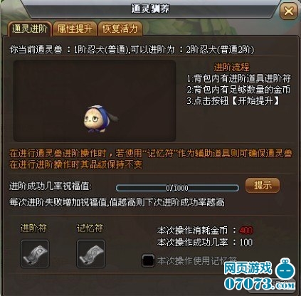 ¡¡¡¡Í¨¹ý½ø½×²Ù×÷¿ÉÒÔÌáÉýͨÁéÊÞµÄÆ·ÖÊ£¬Í¬Ê±Í¨ÁéÊÞÔÚ½ø½×ºóÍâÐÎÒ²»áËæÖ®·¢Éϸı䡣