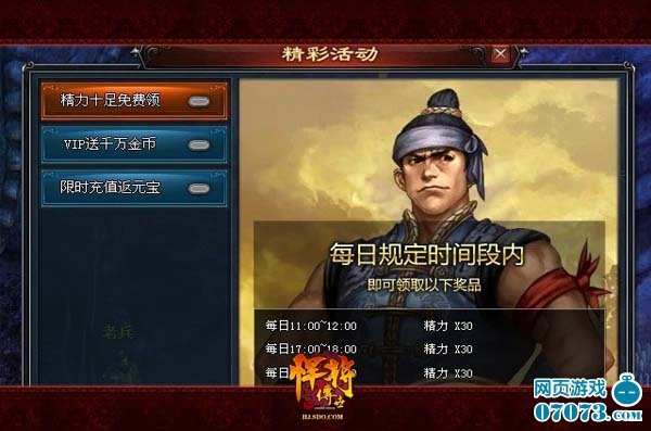 ¡¡¡¡ÔÚ¡¶º·½«´«ÊÀ¡·ÖÐÍæ¼ÒÐèÒªÏûºÄ10µã¾«Á¦Öµ²ÅÄܽøÈëµ¥È˸±±¾½øÐÐÌôÕ½£¬É¨µ´¸±±¾Ê±Ò²ÐèÒªÓÐÏàÓ¦µÄ¾«Á¦Öµ²ÅÄÜ¿ªÊ¼É¨µ´¡£Ã¿°ë¸öСʱ¿ÉÒÔ»Ö¸´5µã¾«Á¦ÖµÖ±µ½¾«Á¦ÖµÉÏÏÞÂú¶î£¬Íæ¼Ò¿ÉÒÔͨ¹ý³å»÷¾«Á¦ÖµÉÏÏÞ¶ÔÓ¦µÄѨλÀ´Ìá¸ß¾«Á¦ÖµÉÏÏÞ¡£³ý×ÔÐлָ´¾«Á¦ÒÔÍâ¡¶º·½«´«ÊÀ¡·»¹ÉèÓо«Á¦Ê®×ãÃâ·ÑÁìµÄ»î¶¯£¬Ã¿Ìì11:00——12:00¡¢17:00——18:00¼°20:00——21:00Íæ¼Ò¾ù¿ÉÒÔͨ¹ý¡¶º·½«´«ÊÀ¡·ÓÒÉϲྫ²Ê»î¶¯µÄ½çÃæÁìÈ¡30µã¾«Á¦Öµ;¾«Á¦Öµ»¹¿ÉÒÔʹÓþ«Á¦Ò©Ë®»ñµÃ£¬Ò°ÍâBOSSÓлú»á±¬³ö¾«Á¦Ò©Ë®ÁíÍâÍæ¼Ò»¹¿ÉÒÔ»¨·ÑÉÙÁ¿½ð±Ò¹ºÂòÏàÓ¦µÈ¼¶µÄ¾«Á¦Ò©Ë®¡£