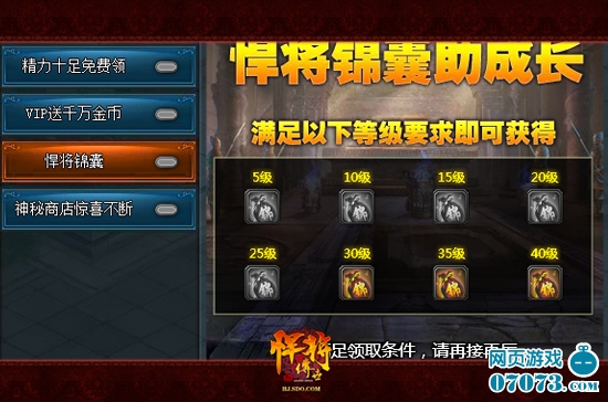 ¡¡¡¡µ±Ã¿¸öº·½«Íæ¼Ò´ïµ½Ö¸¶¨¼¶±ðºó£¬¾Í¿ÉÒÔͨ¹ý»î¶¯Ò³ÃæÁìȡһ¸öº·½«½õÄÒ£¬´ò¿ª½õÄҾͿÉÒÔ»ñµÃ¶ÔÓ¦µ±Ç°¼¶±ðµÄ¼«Æ·×°±¸£¬µÈ¼¶Ô½¸ß½±ÀøÔ½ºÃ£¬¼«Æ·×°±¸½ö´ÎÓÚÉñ¼¶×°±¸£¬ÊÇÓÎÏ·ÖÐ×îÖ÷Á÷µÄÅäÖã¬Æ½Ê±Ò²ÉõÉÙÓлú»á¿ÉÒÔÖ±½Ó»ñµÃ£¬Òò´ËÒª¼´Ê±ÁìȡŶ¡£