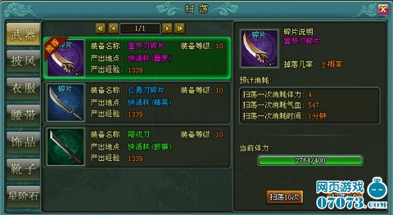 ¡¡¡¡°Ë¡¢É¨µ´×°±¸ºÍʯͷ£¬¾ÍÊÇɨµ´µÍ¼¶±ð×°±¸Ë鯬»òÕß»ñµÃÀ¶É«¡¢ÂÌÉ«ÐÇʯһ¸ö£¬×°±¸ËéÆ¬Ò»°ã5´Î×óÓÒ¡¢Ê¯Í·1´Î×óÓÒ¡£É¨µ´»ù±¾Ò»Ï¾ͳöÁË£¬¾ÍÊÇ»ñµÃÐÇʯ±È½ÏÓôÃÆ£¬µ«ÊÇÓÐÁ˰ï»áµÀ³¡ºó´òÒ»¹ØµÄʱ¼äÒ²¾ÍÍê³ÉÁË¡£