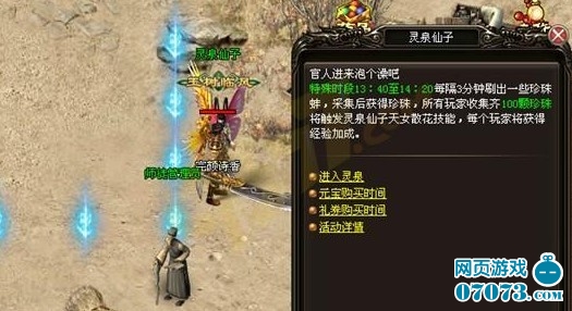 ¡¡¡¡3¡¢ ½øÈëÁéȪÏíÊÜÎÂȪãåÔ¡£¬¿ÉÒÔ»ñµÃ·áºñµÄ¾Ñ飬ȫÌ쿪·Å£¬Ã¿ÌìÏÂÎç(13£º40—14£º20)Êǻ¿ªÆôµÄÌØÊâʱ¶Î£¬½±Àø¼Ó±¶£¬ÔÚÌØÊâʱ¶ÎÖÐÿ¸ô3·ÖÖӾͻáË¢³öÒ»ÅúÕäÖé°ö£¬ËùÓÐÍæ¼ÒÊÕ¼¯Æë100¿ÅÕäÖé¼´¿É´¥·¢ÁéȪÏÉ×ÓÌìŮɢ»¨¼¼ÄÜ¡£ÔÚ³¡Íæ¼Ò¶¼¿É¶îÍâ»ñµÃ¾Ñé¼Ó³É¡£
