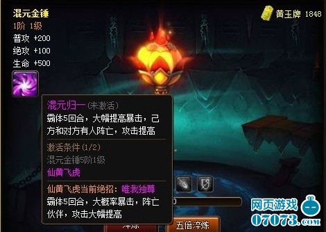 ¡¡¡¡³É¹¦Í¨¹ý¶·Å£¹¬Ö®ºó£¬»Æ·É»¢µÄÇ¿»¯½çÃæÀï¾ÍÄÜ¿´µ½»ìÔª½ð´¸ÁË¡£¼¤»î»ìÔª½ð´¸£¬Í¬ÑùÐèÒªÇàÉ«·ûÓ¡10¸ö£¬×ÏÉ«·ûÓ¡10¸ö£¬»ÆÉ«·ûÓ¡10¸ö¡£¼¤»îÉñÆ÷ÊôÐÔ£¬ÒÔÎåÉ«Éñʯ²»¶ÏÌáÉýÉñÆ÷µÈ¼¶£¬µ±ÉñÆ÷½ø½×µ½5½×1¼¶£¬²¢ÇÒ»ï°é»Æ·É»¢½úÉýΪÏɻƷɻ¢£¬ÉñÆ÷½«»á¿ªÆôרÊô¾ø¼¼“»ìÔª¹éÒ»”£¬Ð§¹ûÊǰÔÌå5»ØºÏ£¬´ó·ùÌá¸ß±©»÷£¬¼º·½ºÍµÐ·½ÓÐÈËÕóÍö£¬É˺¦Ìá¸ß¡£