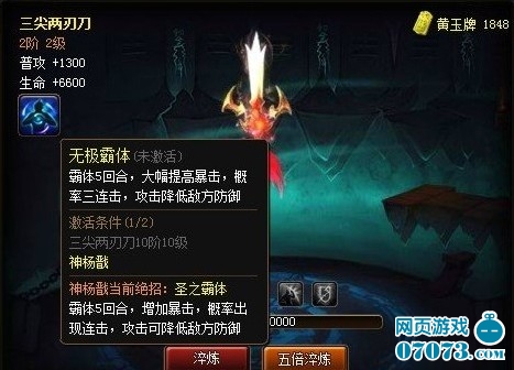 ¡¡¡¡Í¨¹Ø×ÏÏö¹¬£¬»ï°éÑî꯵ÄÇ¿»¯À¸Àï¾Í»á×Ô¶¯Ôö¼ÓÉñÆ÷À¸£¬ÓëÉäÈÕÉñ¹ºÍ»ìÔª½ð´¸Ò»Ñù£¬¼¤»îÈý¼âÁ½Èе¶Ò²ÐèÒª10¸öÇàÉ«·ûÓ¡£¬10¸ö×ÏÉ«·ûÓ¡£¬10¸ö»ÆÉ«·ûÓ¡¡£Éý¼¶Ç¿»¯Èý¼âÁ½Èе¶£¬Í¬ÑùÐèÒªÎåÉ«Éñʯ¡£Î¨Ò»²»Í¬µÄÊÇ£¬ÏëÒª¼¤»îÈý¼âÁ½Èе¶µÄרÊô¾ø¼¼£¬ÐëµÃ½«ÆäÇ¿»¯Éý¼¶µ½10½×10¼¶¡£Èý¼âÁ½Èе¶Ëù¸½¼ÓµÄרÊô¾ø¼¼Îª“ÎÞ¼«°ÔÌ唣¬Ð§¹ûÊǰÔÌå5»ØºÏ£¬´ó·ùÌá¸ß±©»÷£¬¸ÅÂÊÈýÁ¬»÷£¬¹¥»÷½µµÍµØ·½·ÀÓù£¬Ç¿ºáÖ®¼«¡£