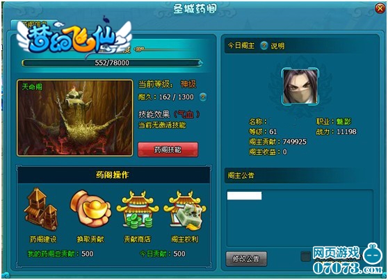 ¡¡¡¡µ±Íæ¼ÒµÄ¹±Ï×´ïµ½Ò»¶¨³Ì¶ÈÖ®ºó£¬¸óÖ÷ÓÐȨÀûÑ¡ÔñÊÇ·ñÉý¼¶Ò©¸ó¡£Ò©¸óÉý¼¶ºóÐÎ̬»á·¢Éú±ä»¯£¬¹¦ÄÜÒ²»á¸üÇ¿´ó¡£ËùÓжÔÒ©¸ó×ö³ö¹±Ï×µÄÍæ¼Ò£¬¾ù¿É»ñµÃÒ©¸óÁ¶Ìå¼¼ÄÜ£¬Éý¼¶Á¶Ìå¼¼Äܿɴó·ùÌá¸ßÈËÎï»ù´¡ÆøÑª¡£Ã¿ÌìÒ©¸ó½¨Éè¹±Ï×ÅÅÃûǰ10µÄÍæ¼Ò½«»ñµÃ³ÆºÅ¼°ÍÇ®½±Àø£¬Ò©¸ó¹±Ï××î¸ßµÄÍæ¼Ò»¹¿É»ñµÃÈ«·þ³ÆºÅ“Ò©¸ó¸óÖ÷”£¬¶ÀÏí¸÷ÖÖÒ©¸óÌØÈ¨¡£