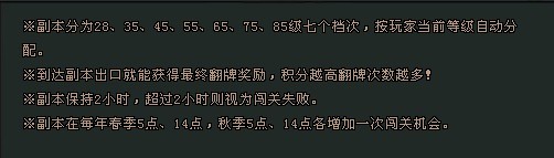 ¡¡¡¡3¡¢»ªÈݵÀ¸±±¾±£³Ö2Сʱ£¬¸±±¾´´½¨³¬¹ý2Сʱºò½«×Ô¶¯ÖØÖá£Íæ¼Òͨ¹ýÍê³É¸±±¾ÄÚµÄÉñÃØÊ¼þ׬ȡ»ý·Ö£¬µ½´ï¸±±¾³ö¿Úºó¾ÍÄÜ»ñµÃ×îÖÕ·ÅÆ½±Àø£¬»ý·ÖÔ½¸ß·ÅÆ´ÎÊýÔ½¶à£¬×î¶à¿É»ñµÃ6´Î·ÅÆ»ú»á¡£×¢Ò⣬ֻÓе½´ï¸±±¾³ö¿ÚÄÜ»ñµÃ·ÅÆ»ú»á¡£