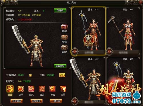 ¡¡¡¡Íæ¼ÒÿÌì¿ÉÒÔÌôÕ½20´Î£¬ÁíÍâ¿ÉÒÔÔª±¦Ôö¼ÓÌôÕ½´ÎÊýºÍͨ¹ýÔª±¦ËÙ¶ÈÇå³þÀäȴʱ¼ä£¬ÔÚÍæ¼ÒµÄÕ½Á¦×´Ì¬À¸ÀÓÐ×Ų»Í¬µÄÕ½Á¦¼ÓÇ¿BUFF£¬Íæ¼Ò¿ÉÒÔͨ¹ýË¢ÐÂ×Ô¼ºµÄÕ½Á¦¼ÓÇ¿BUFF´Ó¶ø´ó´óÌá¸ß×Ô¼ºµÄʵÁ¦²¢ÔÚ¾º¼¼Öлñʤ£¬Ö»ÒªÍæ¼ÒÃÇÔÚ·þÎñǰռ¾Ýǰ10Ãû£¬Ôò»á»ñµÃ·Ç³£·áºñµÄ¾ÑéºÍÈÙÓþ½±Àø£¬²¢ÇÒÿ1Сʱ½±ÀøÒ»´ÎŶ!