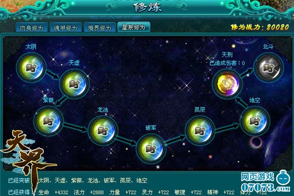 ¡¡¡¡´ò¿ª¡¶Ìì½ç¡·ÐÞÁ¶ÏµÍ³£¬»á¿´µ½¸Ãϵͳ·ÖΪËĸö°å¿é£¬¶øÎÒÃÇҪ˵µÄÐdz½ÐÞΪÅÅÔÚ×îÄ©£¬Õâ²¢²»ÊÇÒòΪËü²»ÖØÒª£¬¶øÊÇÒòΪËüµÄÄѶÈ×î¸ß¡£Ðdz½ÐÞΪ×ܹ²·ÖΪ¾Å¸öÐǽ磺̫Òõ¡¢ÌìÐé¡¢×ÏÞ±¡¢Áú³Ø¡¢ÆÆ¾ü¡¢¹Â³½¡¢µØ¿Õ¡¢ÌìÐ̺ͱ±¶·¡£Íæ¼ÒËùÒª×öµÄ¾ÍÊǽ«ÆäÒ»Ò»»÷Ë飬´Ó¶ø»ñÈ¡´óÁ¿ÊôÐÔ½±Àø¡£