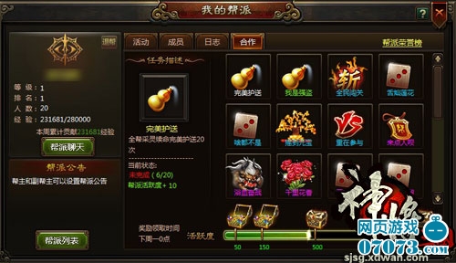 ¡¡¡¡ÔÚÐÖµÜÍæ¡¶Éñ½«Èý¹ú¡·°ïÅÉϵͳÖÐÓÐÒ»¸öÌØÊâµÄÍæ·¨£¬ÔÚÒ»¸ö°ïÅÉÀïµÄ³ÉÔ±ÃǶ¼¿ÉÒÔͨ¹ýÍê³ÉÓÎÏ·ÀïÆäËûϵͳÀ´Ôö¼Ó“ºÏ×÷”µÄ»îÁ¦Öµ£¬Í¨¹ýÍæ¼ÒÿÈÕ¹²Í¬Å¬Á¦ºÍÒ»Æð»¥¶¯´ïµ½Ò»¶¨µÄ»îÔ¾¶È¾Í¿ÉÒÔÁìÈ¡µ½ºÜ·áºñµÄ½±Àø£¬²»µ¥µ¥Óн±ÀøÁìÈ¡»¹¿ÉÒÔ°ïÖú°ïÅÉÉý¼¶È»ºó´øÀ´¸üºÃµÄ¸£Àû¡£