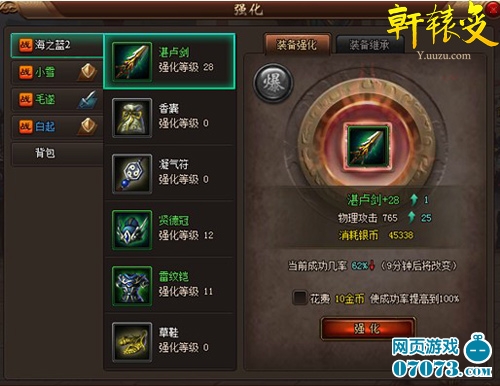 ¡¡¡¡½øÈë×°±¸Ç¿»¯½çÃæ£¬Íæ¼Ò¿ÉÒÔÓÃÒøÁ½À´ÌáÉý×°±¸µÈ¼¶£¬´Ó¶ø»ñµÃÊôÐÔÌáÉý¡£×°±¸¿ÉÇ¿»¯µÄµÈ¼¶ÓëÍæ¼ÒµÄ½ÇÉ«µÈ¼¶Ïàͬ¡£Í¬Ê±£¬×°±¸Ç¿»¯µÄ³É¹¦ÂÊÒ²»áËæÊ±¼ä¶ø±ä»¯£¬µ±¿´¼û³É¹¦ÂÊΪ100%ʱ£¬¾ÍÊǸ÷λ´óÏÀÖýÔ챦¾ßµÄʱºòÁË£¬¹û¶ÏÇ¿»¯°É!