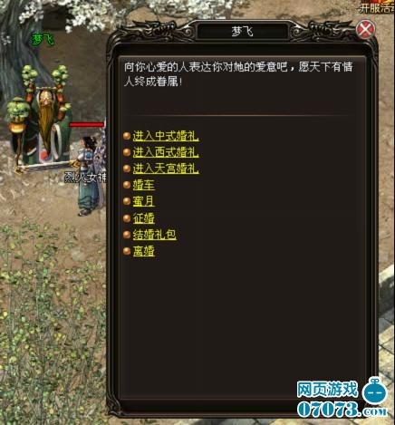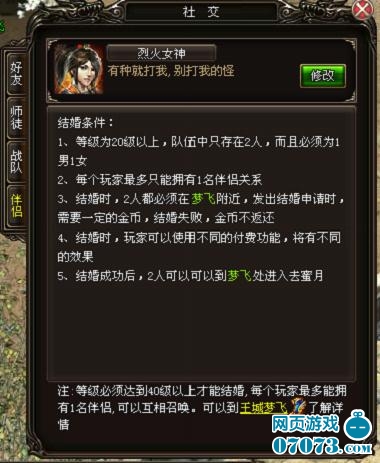 ¡¡¡¡½á»é¹æÔò£ºËùÓÐÂú20¼¶µÄÍæ¼Ò¶¼¿É½øÈ룬µ«½á»é±ØÐëΪ1ÄÐ1Å®£¬¶øÇÒ¶¼ÔÚ¶ÓÎéÖУ¬¶ÓÎéÖв»ÄÜÓÐÆäËû³ÉÔ±¡£Ã¿¸öÍæ¼Ò×î¶àÖ»ÄÜÓµÓÐ1Ãû°é¡£½á»éÐèÒªÓÉÄз½·¢³öÉêÇ룬½á»éË«·½¶¼±ØÐëÒªÔÚÍõ³ÇNPCÃηɸ½½ü£¬½á»éµÄË«·½±ØÐë¶¼ÊÇδ»é¡£Íæ¼Ò¿ÉÒÔÑ¡ÔñÖÐʽ»éÀñ¡¢Î÷ʽ»éÀñ»òÌ칬»éÀñÐÎʽ¡£ÒÑ»éµÄÍæ¼ÒÈç¹ûÏëÒªÀë»é£¬Ö»ÐèÒªÔÚNPC´¦½ÉÄÉÒ»¶¨µÄ½ð±ÒºóÌá½»Àë»éÉêÇë¼´¿É¡£