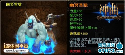幽冥雪猿不只造型威猛,连属性也是绝佳。幽冥雪猿兽魂一旦激活,属性就可以累加在角色原属性之上,力量、护甲、体质及智力将获得全方位提升,其提升力度也远超近来各活动坐骑高达30点哦!