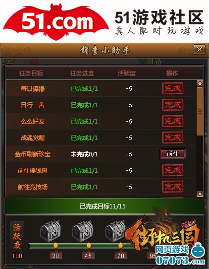 ¡¡¡¡Ö»ÒªÄÍÐĵÄÄã¶¼»á·¢ÏÖ£¬ÔÚÓÎÏ·ÓÒÉϽǿÉÒÔ¿´µ½½õÄÒͼ±ê£¬ÔÚ½õÄÒСÖúÊÖϵͳÖУ¬Ã¿ÌìµÄÈÎÎñÄ¿±ê¡¢½ø¶ÈÒÔ¼°»îÔ¾¶È½±Àø£¬¶¼»áÁеÃÒ»Çå¶þ³þ¡£¡¶51½Ö»úÈý¹ú¡·»á¸ù¾ÝÍæ¼Ò»îÔ¾¶ÈÓɵ͵½¸ß£¬¸øÓèľ±¦Ï䡢ͱ¦Ïä¡¢Òø±¦Ïä¡¢½ð±¦Ïä¡¢×걦ÏäµÈ²»Í¬µÈ¼¶½±Àø£¬Íæ¼Ò¿ÉÒԲο¼Ð¡ÖúÊÖÏ·½µÄÄ¿±êÍê³É³Ì¶È£¬Ïò±¦Ïä³å´Ì!
