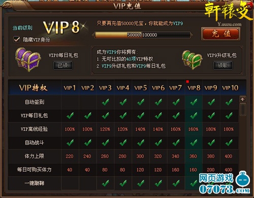 ¡¡¡¡Îª¸ÐÐ»Íæ¼Ò¶Ô¡¶ÐùÔ¯±ä¡·µÄºñ°®£¬ÓÎÏ·½«ÔÚδÀ´µÄ°æ±¾ÖжÔVIPϵͳ½øÐе÷Õû£¬Ê¹Íæ¼ÒÃÇÏíÊܵ½¸ü¶àµÄÓŻݡ£VIP2¼¶½«ÏíÊÜ×Ô¶¯Ç©µ½ºÍÒ»¼ü¾Û±¦¹¦ÄÜ;VIP6¼¶½«ÏíÊܾ۱¦2.5±¶±©»÷¹û×ÓºÍ×°±¸Ò»¼üÖÆÔ칦ÄÜ;VIP8¼¶µÄÖÜÓÎÁйúÃâ·Ñ´ÎÊýÔö¼Ó5´Î;VIP9¼¶½«ÓÀ¾ÃÃâ·ÑʹÓÃÆÕÍ¨ÌæÉíÍÞÍÞ²¢ÇÒÔö¼ÓÃſ͹¤·»ÊÕ»ñ´ÎÊý;VIP10¼¶µÄÿÈÕ¹Ò»úʱ¼ä½«Ôö¼Ó2Сʱ¡£»¹Óиü¶àÓÅ»ÝÄÚÈÝ£¬»¹Çë½øÈëÓÎÏ·ÌåÑéÒ»·¬¡£