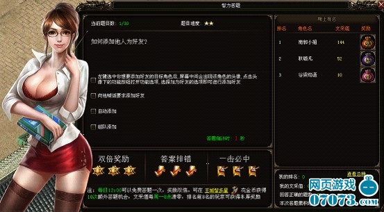 ¡¡¡¡ÖÇÁ¦´ðÌâ(12:00~12:10)˵Ã÷:ÓÐÁËÒ»»÷±ØÖÐ.´ð°¸Åųýºó.ÖÇÁ¦´ðÌâ¾ø·Ç¿¼ÑéÍæ¼ÒµÄÖÇÁ¦.¶øÊÇ¿¼ÑéÍæ¼ÒµÄÒãÁ¦(¿ª¶àºÅµÄÍæ¼ÒÖ±½ÓÒ»¸ö¸öºÅÂÖ×ÅÒ»»÷±ØÖм´¿É).ÁíÍâÕÒ¸öÓÐYYµÄÈ˶àÐлáÒ»°ã¶¼»á×éÖ¯´ðÌâ»î¶¯µÄ.¹ØÓÚ½±ÀøµÄÎÊÌâ.´ó¼ÒǧÍò²»ÒªÖ»¶¢×žÑé.ÿÖÜÉϰñµÄÍæ¼Ò¿ÉÊÇÓдóÁ¿ÈÙÓþÒÔ¼°²Ø±¦Í¼×î¿É¹óµÄ¾ÍÊÇÂí¹ÇË鯬.50¸ö¾ÍÄܺϳɷdz£²»´íµÄÓÀ¾ÃÕ½Âí.