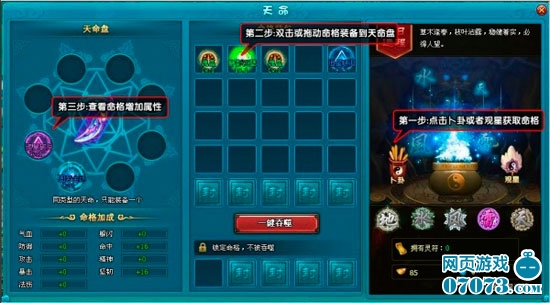 ¡¡¡¡2866¡¶Ãλ÷ÉÏÉ¡·ÌìÃüÅÌ47¼¶¿ªÆô£¬ÃüÅ̸ñ×Ó´Ó47¼¶¿ªÊ¼Ëæ×ŵȼ¶µÄÔö¼Ó¶øÔö¼Ó£¬Ã¿Ôö¼ÓÒ»¸öµÈ¼¶£¬ÃüÅ̸ñ×ÓÔö¼ÓÒ»¸ö¡£ÔÚÓÎÏ·ÖÐ×ܹ²ÓÐ8ÖÖÃü¸ñ£¬ÖÖ¶¼¶ÔÓ¦¼Ó³É ÆøÑª¡¢·ÀÓù¡¢¹¥»÷¡¢±©»÷¡¢¶ãÉÁ¡¢ÃüÖС¢¾«ÉñºÍ·¨ÉË¡¢¼áÈ͵ÈÏà¹ØµÄÊôÐÔ¡£ÈçÈôÄÜ»ñµÃÃü¸ñ£¬ÄÇô·ÉÏÉÐÞÐÐÕß½«»ñµÃÏàÓ¦µÄÊôÐԼӳɣ¬ÕâÃü¾ÍÎÕÔÚËû×Ô¼ºÊÖÀ¾Í¿´ËûÐÐʲôÔË¡£