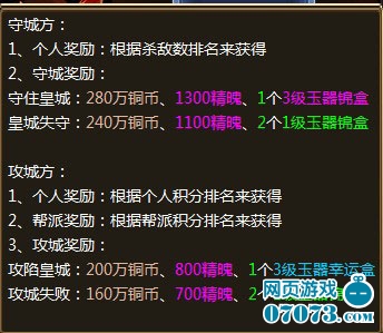 ¡¡¡¡Ö»ÒªÔڻʳǷé»ðµ±ÖзÀÊØ³É¹¦»òÕß¹¥ÆÆ»Ê³ÇÒ»·½µÄ°ïÅÉ£¬¶¼¿ÉÒÔ»ñµÃ·áºñµÄ½±Àø¡£ÏëÒª»ñµÃʤÀûÒ»·½¾ÍÐèÒª²¼Öúò¿Êð£¬ÈðïÅÉÈËÔ±¶¼ÂúÔ±ÉÏÏߣ¬²ÅÄÜ»ñµÃ×îºóµÃʤÀû£¬Äõ½»Ê³Ç·é»ð»î¶¯²Å¿ÉÒԵõ½µÄ¼«Æ·3¼¶ÓñÆ÷¡£