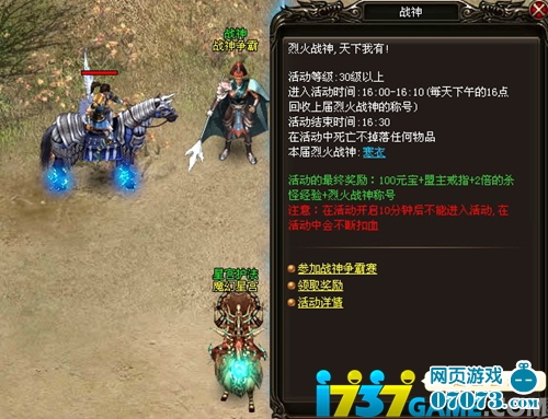 ¡¡¡¡ÏëÒªÓµÓГÁÒ»ðÕ½Éñ”Õâ¸öÎÞË«ÏÞʱ³ÆºÅ²¢·ÇÒ×Ê£¬Ê×ÏÈ£¬ÄãµÃÈ¥²Î¼Ó“Õ½ÉñÕù°Ô”»î¶¯£¬ÕâÊÇÿÌì16:00~16:30¶¼»á¿ªÕ¹µÄÒ»ÏîÕù°ÔÈü£¬Ö»ÒªµÈ¼¶´ïµ½30¼´¿É²ÎÓ룬Ôڻ¿ªÆôºó£¬Èü³¡¾ÍÍðÈç¹Å´ú¶·ÊÞ³¡°ãѪÐȲпᣬÔÚÕâÀï£¬ËæÊ±¶¼¿ÉÄܱ»ËûÈË»÷ɱ£¬ÕâÕýÊÇ¿¼ÑéðÏÕÕßÃǵÄÉú´æÄÜÁ¦£¬ËÄÜЦµ½×îºó£¬Ë¾ÍÊDZ¾½ìÁÒ»ðÕ½Éñ!