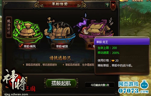 ¡¡¡¡ÐÖµÜÍæÉñ½«Èý¹úÍæ¼ÒֻҪͨ¹ý³à±Ú“ÆßÐÇ̳1”¹Ø¿¨ºó¾Í»á¿ªÆô£¬È»ºóÔÚÓÎÏ·½çÃæÉÏ·½Íæ¼Ò¼´¿Ì¾Í¿ÉÒÔÕÒµ½“²Ý´¬½è¼ý”°´Å¥½øÈë¡£½øÈëСÓÎÏ·»ÃæÍæ¼Ò¿ÉÒÔÓÐÈý¸öÑ¡ÏѡÔñÒ»Ö»´¬¾Í¿ÉÒÔ½øÈëÓÎÏ·£¬µ«Ñ¡Ôñ²»Í¬µÄ´¬Ö»£¬ÑªÁ¿Ò²»á²»Ò»Ñù£¬´¬Ö»µÄÆ·ÖÊÔ½¸ßÉúÃüÖµÒ²¾ÍÔ½¸ß£¬¶øÇÒËÙ¶È»á±äµÃ¸ü¿ì¡£