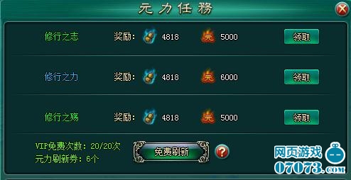 ¡¡¡¡ÔªÁ¦ÈÎÎñ£¬ÔªÁ¦ÊÇÓÃÀ´ÌáÉýÐÞÐÐÊôÐÔµÄ×ÊÔ´£¬¸ÃÈÎÎñÿÌì¿É½øÐÐ10´Î£¬ÈÎÎñÆ·ÖÊ·ÖΪ£ºÂÌ¡¢À¶¡¢×Ï¡¢³È£¬Ê¹ÓÃÔªÁ¦Ë¢ÐÂȯ¿ÉÒÔˢУ¬VIPÍæ¼ÒÿÌìÓÐ20´ÎÃâ·ÑˢдÎÊý¡£Ð¡±à½¨ÒéÍæ¼Ò¶àÊÕ¼¯Ë¢ÐÂȯ£¬×îºÃ°Ñ10´ÎÈÎÎñ¶¼Ë¢Ðµ½³ÈÉ«À´×ö¡£