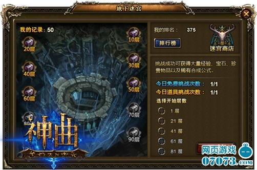 ¡¡¡¡Èç¹û˵¡¶ÉñÇú¡·ÃÔ¹¬ÖвØÄä×Å´óÁ¿µÄ±¦±´Ò»µã¶¼²»Îª¹ý¡£ÔÚÃÔ¹¬Öв»½ö½öÓÐÉϵȵÄ×°±¸£¬»¹»áÓÐÌáÉý×°±¸µÄ±¦Ê¯¡£¡¶ÉñÇú¡·ÃÔ¹¬×ܹ²ÓÐ100²ã£¬Ã¿¸ô5²ã½«»á³öÏÖÒ»¸öboss£¬Ë³ÀûսʤbossÖ®ºó£¬Íæ¼Ò½«»áËæ»ú»ñµÃ½±Àø¡£Ã¿¸öÍæ¼Ò½ÇɫÿÌìÓÐÒ»´ÎÃâ·Ñ½øÈëÃÔ¹¬µÄ»ú»á£¬µ±Ê¹ÓÃÃÔ¹¬Ô¿³×ʱ£¬½øÈëÃÔ¹¬½«»á»ñµÃË«±¶µÄ½±Àø¡£µ±È»£¬Ò²²»ÒªÐ¡¿´ÁËÃÔ¹¬ÖеÄÊØÎÀ£¬ÏëҪ˳Àûͨ¹ý100²ã£¬ÄÇ»¹ÕæµÄÐèÒª¶ÍÁ¶Íæ¼ÒµÄÄÍÁ¦¡£