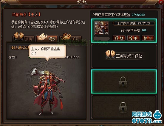 ¡¡¡¡³ÉΪÖ÷È˺ó£¬Äú¿ÉÒÔÇýʹūÁ¥È¥¹¤×÷£¬ÎªÄú׬ȡ¾Ñé¡£³ý´ËÖ®Í⣬Ö÷ÈË»¹¿Éͨ¹ýµ÷Ï·Å«Á¥»ñµÃ¶îÍâ¾Ñ顣ÿ´Îµ÷Ï·»á²úÉú5·ÖÖÓµÄCDʱ¼ä¡£×ÜCDʱ¼ä´ïµ½20·ÖÖӺ󣬱»µ÷Ï·µÄÅ«Á¥½«½øÈëÐÝϢ״̬¡£µÈ¼ÒÅ«ÐÞÑø¹»ÁË£¬Äú²ÅÄܼÌÐøµ÷ϷСūÁ¥£¬×¬È¡½±Àø¡£