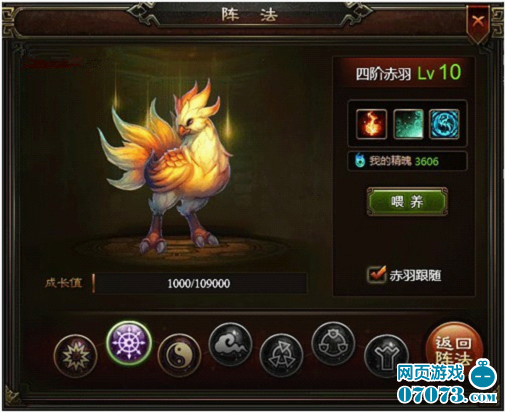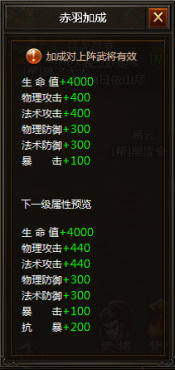 赤羽通过喂养精魄获得成长值,成长值达到要求后就可以升级进阶。赤羽的等级和阶数直接影响了阵法的开放和上阵武将的属性加成,如下图。