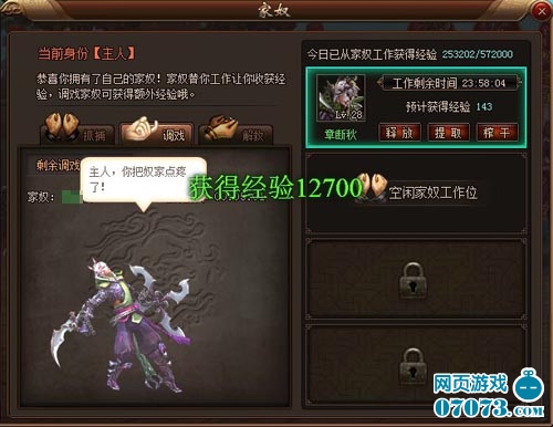 ¡¡¡¡ÕýËùν¼ÒÅ«ÔÚÊÖ£¬³ÔºÈ²»³î! ÓÐÁËСūÁ¥£¬Ö÷È˾ͿÉÒÔÈÎÒâÅÉDzËûÃÇÈ¥¹¤×÷£¬´ÓËûÃÇÉíÉÏ¿ÉÒÔ׬ȡ´óÁ¿¾Ñé¡£¶ÔÓÚÏëÒªÉý¼¶µÄÍæ¼ÒÀ´Ëµ£¬¿ÉÊǼÛÖµ²»·ÆµÄ½±ÀøÅ¶¡£¸£Àû²»Ö¹Ò»µãµã£¬¼ÒÅ«»¹ºÜÎ޳ܵØÇóµ÷Ï·¡£µã»÷Å«ÆÍµ÷Ï·£¬Å«ÆÍÈö½¿Ò»¾ä£º“Ö÷ÈË£¬ÄãÄܲ»ÄÜÎÂÈáµã!”£¬ÇóÈÄÖ®Ó໹»áÏ×É϶îÍâµÄ¾Ñé½±Àø¡£ÕâÑùÎ޽ڲٵĸ£Àû£¬ÔõÄܲ»¼¤ÆðÍæ¼ÒÐÄÖвã²ãÁ°äô?¼¤Çéµ÷Ï·£¬ÎÞ¾¡ÓÕ»ó¡£