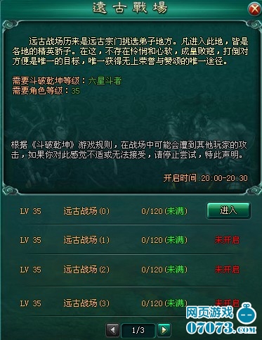 ¡¡¡¡1. µ¯´°½øÈ룬ս³¡¿ªÊ¼ÔÚÆÁÄ»ÖÐÑëΪµÈ¼¶´óÓÚ35µÄÔÚÏßÍæ¼Òµ¯³öÌáʾ½øÈëµÄ°´Å¥¡£