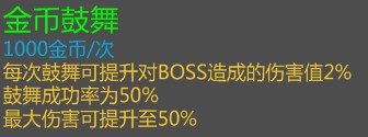 ¡¡¡¡ÔÚÓÎÏ·Öл¹ÓÐÒ»¸ö×îÓÐÒâ˼µÄС¼¼ÄÜÊÇÕ½¶·BUFF¡£Õ½¶·BUFFÓÐ2¸ö£¬·Ö±ðÊÇ£º×êʯ¹ÄÎèºÍ½ð±Ò¹ÄÎè¡£×êʯ¹ÄÎèµÄÆô¶¯ÂÊΪ100%£¬Ê¹ÓÿÉÒÔ¶ÔBOSSÔì³É5%µÄÉ˺¦£¬×î´óÉ˺¦¿ÉÌáÖÁ100%¡£¶ø½ð±Ò¹ÄÎè³É¹¦µã»÷ºó¿ÉÒÔÔö¼Ó½ÇÉ«Ôì³ÉµÄÉ˺¦Öµ2%£¬²»¹ý³É¹¦ÂÊÊÇ50%£¬×î¸ß¿É´ïÉÏÏÞֵҲΪ50%£¬ËùÓжÔBOSS²úÉúµÄÉ˺¦Öµ¶¼»áÔÚÓÎÏ·ÆÁÄ»ÖгöÏÖ£¬ÒÔ±ãÈÃÍæ¼Ò¸üºÃµÄÁ˽â¶ÔBOSSµÄÊôÐÔÉ˺¦¡£ÖÁÓÚ2ÖÖÕ½¶·BUFF¼¼ÄÜÔõôѡÔñ£¬¾Í¿´Íæ¼Ò×Ô¼ºµÄ°®ºÃÀ²~