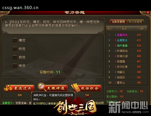 ¡¡¡¡360¡¶´´ÊÀÈý¹ú¡·ÈÕ³£´ðÌ⣬ÊÇ·á¸»Íæ¼Ò֪ʶµÄÒ»ÖÖÍæ·¨£¬Íæ·¨¿ÉÒÔͨ¹ý×Ô¼ºÓµÓеķḻ֪ʶÀ´×¼È·´ðÌâ»ñµÃ¾Ñé½±Àø¡£Èç¹ûÍæ¼ÒʵÔÚÄò»×¼ÕâµÀÌâµÄ׼ȷ´ð°¸£¬¿ÉÒÔͨ¹ýÃÉ»ì¹ý¹ØÓëÁéÑÛÉñͨÁ½ÖÖ·½Ê½½øÐС£ÖµµÃÒ»ÌáµÄÊÇ£¬ÃÉ»ì¹ý¹ØÊÇÏûºÄ20Ôª±¦Íê³É´ðÌâ¡£¶øÁéÑÛÉñͨÔòÊÇͨ¹ýÏûºÄͱÒÌÞ³ý´ð°¸µÄ·½Ê½½øÐеġ£ÏµÍ³»á¸ù¾ÝÍæ¼ÒµÄ´ðÌâÇé¿ö½øÐÐÅÅÐУ¬´ðÌâԽ׼ȷ¡¢ËÙ¶ÈÔ½¿ìµÄÍæ¼ÒÅÅÃû¾ÍÔ½¿¿Ç°¡£