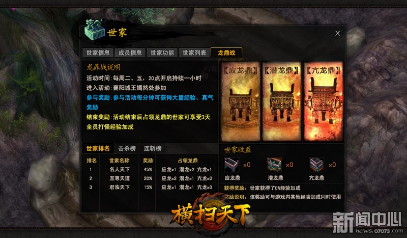 ¡¡¡¡Áú¶¦Ö®Õ½ÊÇ¡¶ºáɨÌìÏ¡·ÊÀ¼ÒÖÐ×î´óµÄPVP»î¶¯£¬Ã¿Öܶþ¡¢Î壬20µã׼ʱ¿ª·Å£¬ÏåÑô³ÇÍõæÌÈ»´¦²Î¼Ó¡£ÔÚÁú¶¦Õ½³¡ÖÐÕùÇÀÁú¶¦£¬¹ý³ÌÖÐÁ¬Õ¶¡¢»÷ɱÈËÊý×î¶àµÄÍæ¼Ò£¬¿É»ñµÃÒ»¶¨½±Àø¡£»î¶¯½áÊøÓµÓÐÓ¦Áú¶¦¡¢Ç±Áú¶¦¡¢¿ºÁú¶¦µÄÊÀ¼Ò£¬ËùÓÐÊÀ¼Ò³ÉÔ±¶¼½«»ñµÃÏàÓ¦µÄ´ò¹Ö¾Ñé¼Ó³É¡£
