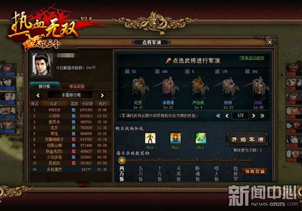¡¡¡¡È«Ì쿪·Å£¬¾ýÖ÷¿ÉÒÔÑ¡ÔñËæÉíÎ佫ÖеÄÈÎÒâÒ»ÃûÎ佫²Î¼Ó¾üÑݻ£¬Ã¿Ìì²ÎÓëÈý´Î¡£ ½øÈë¾üÑݽ«ÔâÓö10²¨µÐÈË£¬²ÎÑÝÎ佫ÕóÍö¡¢»ò»÷ɱȫ²¿µÐÈËÍê³É¾üÑÝ¡£(Ìáʾ£ºÐ°汾ÖмÓÈëÁ˵оüÎ佫!)¸ù¾Ý¾üÑÝɱµÐÊýÁ¿·¢·ÅÏàÓ¦½±Àø£¬½±Àø°üÀ¨ÍÚ¿óÁǿ»¯Ê¯Ë鯬ºÍ½«ÁÿÌìµÄÅÅÃû½±Àø»¹½«ÓÐÓ¢ÐÛÁî¿ÉÒÔ»ñµÃ¡£