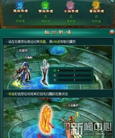 ¡¡¡¡´«ÎÅÂֻعųÇÖÐÉèÓÐËÄ×ù¼À̳£¬Ã¿×ù¼À̳ÖýÓÐÒ»ÃæÊØ»¤µñÏñ¡£¡¶¶·ÆÆÇ¬À¤¡·ÂÖ»ØÕ½³¡¿ªÊ¼ºó£¬Íæ¼Ò¿ÉÔÚ¼À̳ÖÜΧΪµñÏñ³äÄÜ£¬ÄÜÂúºóµñÏñ¹éÊôÍæ¼ÒÕóÓªÒ»·½£¬Îª¸ÃÕóÓªÔ´Ô´Ìṩս»ê¡£Õ½³¡ÒÔÕ½»ê¶àÉÙ¶¨ÊäÓ®£¬ÆäËûÕóÓªÍæ¼Ò¿É¹¥»÷ÒѳäÄܵñÏñ£¬Òò´ËʤÀûµÄÄ¿±êÔÚÓÚÇÀ¶á¾¡¿ÉÄܶàµÄµñÏñ¡£