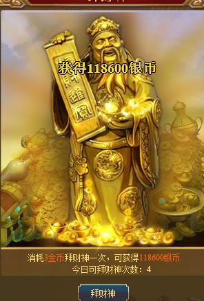 ¡¡¡¡ÔÚ17673¡¶¶·½«»ê¡·£¬ÏëҪ˲¼äÓÐÇ®£¬×î¿ìËٵķ½·¨¾ÍÊÇ“°Ý²ÆÉñ”ÁË¡£Íæ¼ÒÿÌìÓÐÁù´Î»ú»á¿ÉÒ԰ݲÆÉñÒ¯£¬²ÆÉñÒ¯Ò»¸ßÐË£¬½ðÒø²Æ±¦¹ö¹öÀ´¡£µ«ÊǰݲÆÉñÒ²ÐèÒªÍæ¼Ò±íʾµã“ÐÄÒ┣¬ÔÚ¶·½«»ê£¬Íæ¼Ò»¨·Ñ3½ð±Ò¾Í¿É°Ý²ÆÉñÒ»´Î£¬Ã¿´Î°Ý²ÆÉñ¿É»ñµÃ118600Òø±Ò¡£ºÜ»®Ëã°É£¡