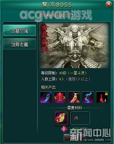 ¡¡¡¡Ç°ÌáÌõ¼þÊDzÎÓëµÄÍæ¼ÒµÈ¼¶±ØÐë´ïµ½40¼¶£¬¶·ÆÆÇ¬À¤³ÆÎ½ÎªÒ»ÐǶ·ÁéÒÔÉϲÅÄÜÔÚ°ïÅɽçÃæµã»÷¡¾bossÕÙ»½¡¿°´Å¥¿ªÆô¡£ÕÙ»½¹ÅĹŻêBOSSÊÇÐèҪǿÕ߯øÏ¢300£¬Õлêá¦5¸ö£¬ÕÙ»½Ê´¹ÇÀÏħBOSSÐèҪǿÕ߯øÏ¢120¡£
