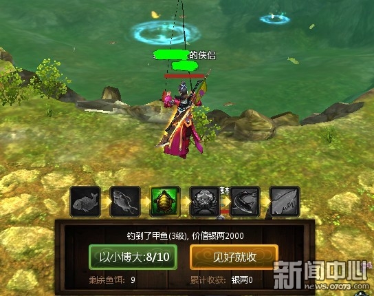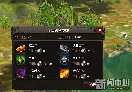 ¡¡¡¡µã»÷“Íæ·¨”È»ºóÑ¡Ôñ“º«ÌÄÓæ³¡”¿É½øÈëÓæ³¡£¬µã»÷¡¾¿ªÊ¼µöÓã¡¿¼´¿É×Ô¶¯½øÈëµöÓã״̬¡£ÊýÃëÖ®ºó£¬»á×Ô¶¯µöÉÏÀ´Ò»ÌõÓ㣬ÖÖÀàËæ»ú¡£ÓãµÄÖÖÀàÓÐÁùÖÖ£¬Æ·Öʴӵ͵½¸ß·Ö±ðÊÇÀðÓã¡¢Îä²ýÓã¡¢¼×Óã¡¢´óբз¡¢ÖлªöàºÍ½ðÁúÓ㡣ÿһÖÖ³öÊÛËù»ñµÃµÄÒø±ÒÒ²²»Ò»Ñù£¬ÀðÓã500Òø±Ò£¬Îä²ýÓã1000¡¢¼×Óã2000¡¢´óբз4000¡¢Öлªöà8000£¬½ðÁúÓã15000¡£