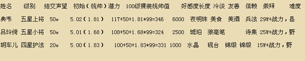 ¡¡¡¡ÓÉÓÚÉÏÃæÒѾ·ÖÎö£¬ÕâÀï²»ÔÙ׸Êö£¬Ö±½Ó¸øÊý¾Ý£º100¼¶ºú³µ¶ù³ç°Ý+½áÒå=281*1.2+50=387£¬100¼¶ÂÀÁáç²³ç°Ý+½áÒå=274*1.2+50=378,100¼¶µäΤÐÅÀµ+½áÒå=296*1.15+50=390£¬Óɴ˿ɼûºú³µ¶ù¶·½«ÐÔ¼Û±ÈNO.1£¨±ÊÕߵijµ¶ùÊÇÔÚ¿ÍÕ»ÕеÄ~-~£©È·ÊµÊǵ±Ö®ÎÞÀ¢µÄ£¬ÒòΪ³µ¶ù²»½öÓÂÎä½ôÒ§µäΤ²»·Å£¬ÖÇıDZÁ¦¸üÊÇÒÔ1.38Í걬µäΤµÄ0.99£¬ÖÚËùÖÜÖª¶·½«ÖÐËÄÏîÊôÐÔÖ»¿´ÓÂÎäºÍÖÇ£¬µäΤÊÇÊäÔÚͳ˧½Ï¸ßÉÏÁË¡£¶øÎåÐÇС½«ÂÀMMËäÈ»ÓÂÎäÂÔÊäÁ½ÈËÒ»³ï£¬µ«Ëý¿ÉÊÇÈÈ2ͳ˧100¼¶Âãװͳ˧NO.1£¬Ò²Êdz¬ÖµµÄ½«Áì¡£